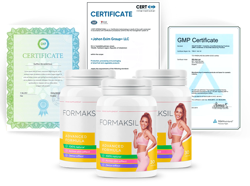 • Em 2024, foram realizados estudos clínicos na Universidade de Medicina de Lisboa, Portugal. O FORMAKSIL passou em todos os estudos clínicos necessários, demonstrou grande eficácia no combate ao excesso de peso NCT05463003 e é aprovado pela Associação Portuguesa de Dietética. O Instituto de Dietética classificou o FORMAKSIL como tendo uma composição orgânica 100% natural e adequada para todas as faixas etárias, sem efeitos secundários. O FORMAKSIL recebeu todas as certificações necessárias. Em 2025, foi realizado um segundo estudo independente na Clínica «Smart Nutrition» em Portugal, que confirmou totalmente os resultados internos.